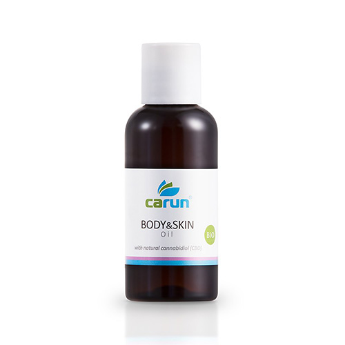 Telový a pleťový konopný olej Carun obsahuje konopný, olivový a jojobový olej a tiež účinnú látku CBD (Cannabidiol).